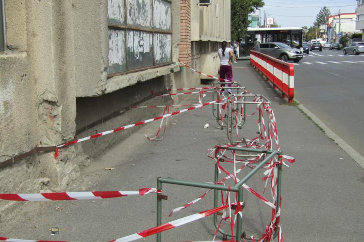 * la sfârşitul lunii iulie, Poliţia Locală a somat firma de confecţii ca, în termen de maxim o lună, să îndepărteze glaful metalic care ar putea oricând să cadă peste trecători * luna a trecut, iar pericolul rămâne, trotuarul fiind în continuare blocat cu benzi de plastic