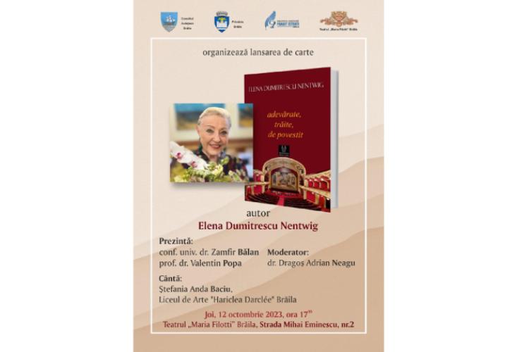 Biblioteca Județeană “Panait Istrati” Brăila, în colaborare cu Teatrul “Maria Filotti” vă invită joi, 12 octombrie 2023, ora 17.00, la lansarea cărții “Adevărate, trăite, de povestit” scrisă de soprana Elena Dumitrescu Nentwig. Evenimentul are loc la Teatrul “Maria Filotti”, iar intrarea publicului este liberă.