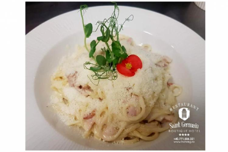 Intr-o oala punem apa la fiert pentru paste, cand apa a dat in clocot punem un praf de sare si adaugam pastele. Lasam la fiert 8 minute, intre timp incingem o tigaie si punem baconul la calit, cand se rumeneste bine stingem cu vin si lasam sa se evapore alcoolul. Amestecam smantana cu parmezanul, oul si apa si le adaugam peste baconul calit. Scurgem pastele si le adaugam in tigae mai lasam 3-4 minute la foc iute amestecand continuu in paste, pana devin cremoase.