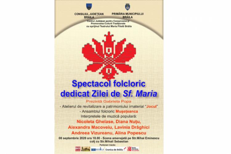 Astăzi, 8 septembrie, de la ora 18.00, pe scena amenajată în parcarea Poliţiei, pe strada Mihai Eminescu, la intersecţia cu strada Mihail Sebastian va avea loc un spectacol folcloric dedicat Zilei de Sfânta Maria. Evenimentul este organizat de Consiliul Judeţean Brăila, Primăria Municipiului şi Centrul Judeţean pentru Conservarea şi Promovarea Culturii Tradiţionale, cu sprijinul Teatrului „Maria Filotti”. Vor urca pe scenă: Ansamblul folcloric MUŞEŢEANCA şi interpretele de muzică populară Nicoleta Ghelase, Diana Nuţu, Alexandra Macoveiu, Lavinia Drăghici, Andreea Vizureanu, Alina Popescu, alături de Atelierul de revitalizare a patrimoniului imaterial JOCUL.