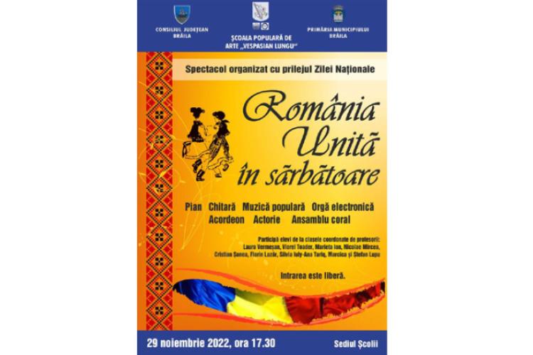 Manifestarea, organizată sub genericul „România unită în sărbătoare”, va avea loc pe data de 29 noiembrie a.c., începând cu ora 17.30, la sediul Școlii Populare de Arte „Vespasian Lungu” Brăila, cu participarea elevilor de la clasele de pian, chitară, canto muzică populară, orgă electronică, acordeon, actorie și ansamblu coral, coordonate de profesorii Laura Vermeșan, Viorel Toader, Marieta Ion, Nicolae Mircea, Cristian Șonea, Florin Lazăr, Silvia Iuly-Ana Tariq, Marcica și Ștefan Lupu.