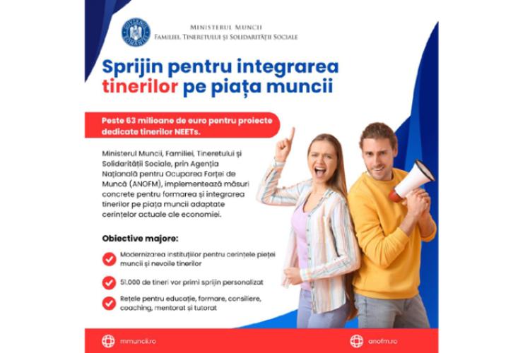 Sprijin pentru integrarea tinerilor pe piața muncii: peste 63 milioane de euro vor fi alocați, în perioada următoare, pentru proiecte dedicate tinerilor NEETs (care nu sunt angajați și nu urmează niciun program de formare).