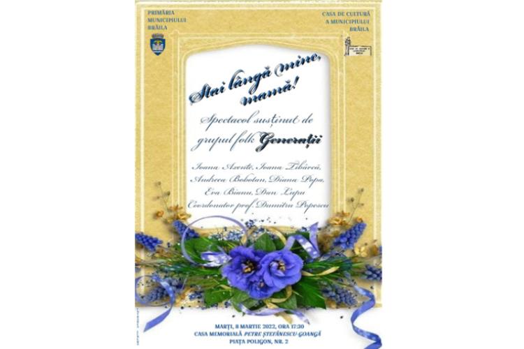 „În cadrul spectacolului intitulat „Stai lângă mine, mamă!”, cei mai mici membri ai Grupului folk „Generații” (Dan Lupu, Ioana Axente, Eva Bianu, Andreea Bobotan, Ioana Tăbârcă, Diana Popa) coordonați de profesorul Dumitru Popescu, vor interpreta cântece pentru mamele, bunicile și surorile lor, pe versurile unora dintre cei mai de seamă poeți români – Tudor Arghezi, Virgil Carianopol, Otilia Cazimir, Ștefan Octavian Iosif, Grigore Vieru, Dumitru Matcovski”, precizează conducerea instituției.