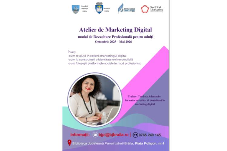 Biblioteca Județeană „Panait Istrati” Brăila și agenția See First Marketing îi invită pe brăileni să participe, începând din luna octombrie, la Atelierul de Marketing Digital – modul pentru adulți, un program GRATUIT de inițiere în marketing digital, destinat celor care vor să se dezvolte profesional. Atelierul se adresează adulților cu domiciliul în municipiul și județul Brăila, persoanelor aflate în activitate sau în căutarea unui nou început profesional, precum și începătorilor în marketing.