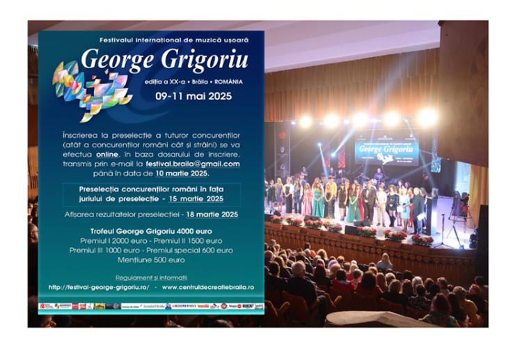 Astfel, Consiliul Județean Brăila, Centrul Județean pentru Conservarea și Promovarea Culturii Tradiționale (Centrul de Creație) și Primăria Municipiului Brăila organizează, în perioada 9-11 mai 2025, cea de-a XX-a ediție a Festivalului Internațional de Muzică Ușoară „George Grigoriu”, dedicat memoriei maestrului George Grigoriu, unul dintre cei mai mari compozitori ai României. Potrivit organizatorilor, festivalul-concurs este „un proiect intercultural ce se desfășoară sub semnul numelui celui înscris în Cartea de Aur a muzicii ușoare românești, George Grigoriu, a cărui activitate artistică este recunoscută prin numeroasele sale creații muzicale lăsate moștenire noilor generații de muzicieni”. Festivalul are drept scop promovarea muzicii ușoare autentice, afirmarea și lansarea tinerelor voci, stimularea valorilor interpretative în vederea plasării lor în elita muzicii ușoare românești și internaționale.