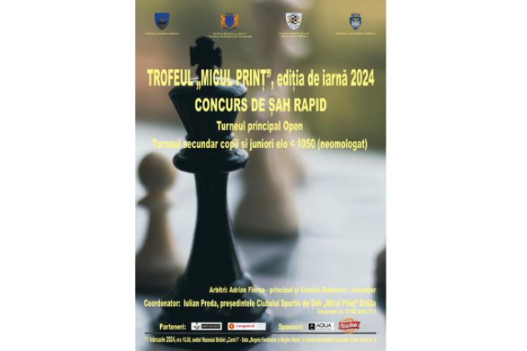 Duminică, 11 februarie 2024, la sediul Muzeului Brăilei „Carol I”, din Centrul Istoric al Municipiului Brăila – Piața Traian nr. 3 (în două locații consecutiv, Sala „Regele Ferdinand I și Regina Maria” și Centrul Diversității Culturale) va fi organizat Trofeul „Micul Prinț” Brăila, ediția de iarnă 2024 (concurs de șah rapid). Acesta se va desfășura pe două secțiuni: Turneul principal Open și Turneul copii și juniori elo < 1050 (neomologat).