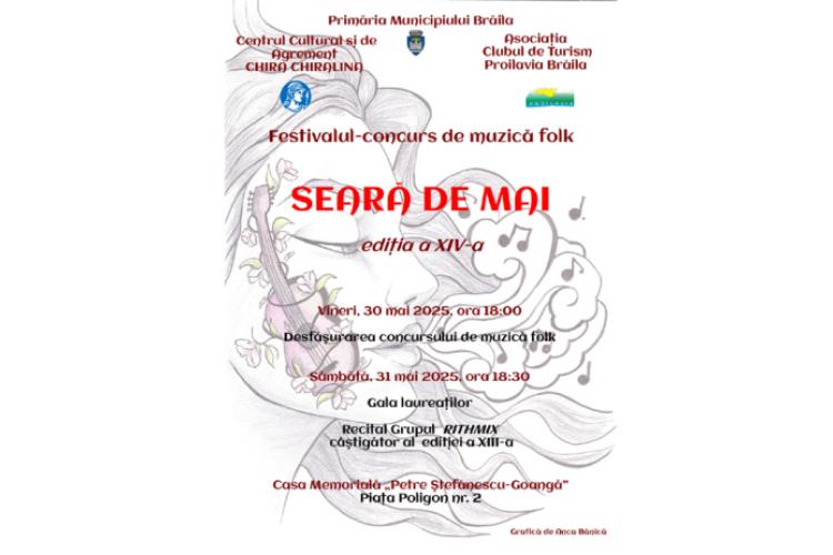 Centrul Cultural și de Agrement „Chira Chiralina” Brăila, în parteneriat cu Asociaţia Clubul de Turism „Proilavia” organizează, în perioada 30-31 mai, cea de a XIV-a ediție a Festivalul Concurs de Muzică Folk „Seară de Mai”.