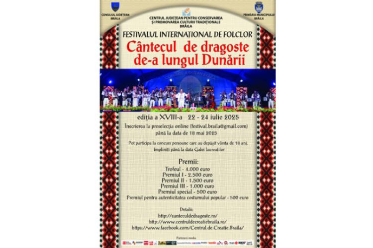 Organizat, an de an, de Consiliul Județean Brăila, prin Centrul Județean pentru Conservarea și Promovarea Culturii Tradiționale, alături de Primăria Municipiului Brăila, pe scena de la Esplanada Dunării, Festivalul „Cântecul de dragoste de-a lungul Dunării” a ajuns, iată, la cea de-a XVIII-a ediție.