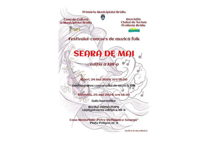 Casa de Cultură a Municipiului Brăila, în parteneriat cu Asociaţia Clubul de Turism „Proilavia” organizează, în perioada 24-25 mai, cea de a XIII-a ediție a Festivalului Concurs de Muzică Folk „Seară de Mai”. Manifestarea reunește tineri din Brăila care doresc să-și afirme potențialul artistic în domeniul creației și interpretării muzicii folk și se va desfășura open-air, în vasta curte a casei în care a trăit familia armatorului grec Ianis Matukis, în Piața Poligon.