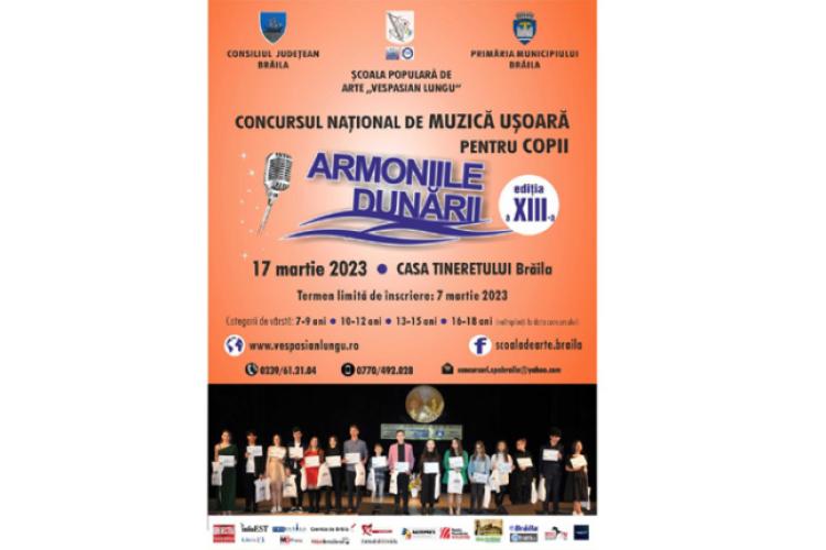 Start pentru înscrieri la cea de a XIII-a ediție a Concursului Național de Muzică pentru Copii „Armoniile Dunării”, care va avea loc în ziua de 17 martie 2023, la Casa Tineretului. Evenimentul este organizat de Școala Populară de Artă „Vespasian Lungu” Brăila, cu sprijinul Consiliului Județean și al Primăriei Municipiului Brăila, iar termenul limită de înscriere este 7 martie 2023.