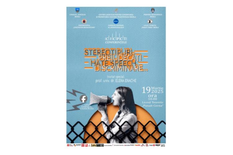 Consiliul Județean Brăila, prin Centrul Județean pentru Conservarea și Promovarea Culturii Tradiționale (CJCPCT) și Primăria Municipiului Brăila, în parteneriat cu Consiliul Național al Audiovizualului, Universitatea „Constantin Brâncoveanu” și Liceul Teoretic „Panait Cerna” Brăila organizează miercuri, 19 martie, începând cu ora 10:00, în incinta unității de învățământ brăilene, Conferința tematică „Stereotipuri, Prejudecăți, Hate speech, Discriminare”.