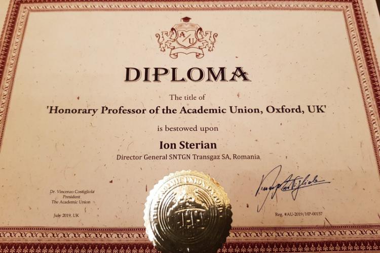 • directorului general al Transgaz, brăileanul Ion Sterian, i-a fost înmânată această distincţie în cadru festiv, la Milano • titlul de Profesor Onorific vizează domeniul afacerilor şi managementului şi aduce cu el, printre altele, noi oportunităţi de promovare a activităţilor pe care compania publică le desfăşoară în Europa şi în afara graniţelor europene
