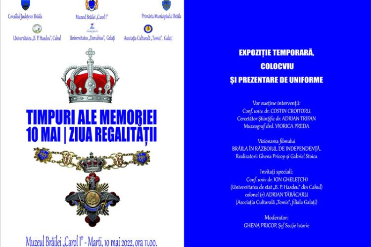 Ziua Regalității (10 Mai), celebrată în România ca zi de sărbătoare națională (declarată astfel prin Legea nr. 103/2015) va fi sărbătorită așa cum se cuvine, cu mare fast, la Muzeul Brăilei „Carol I”, instituție care poartă numele MS Carol I, primul Rege al României.