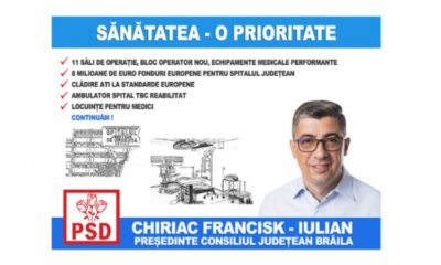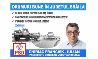 • candidatul PSD Brăila pentru preşedinţia Consiliului Judeţean, Francisk Chiriac, s-a înscris în campania “Bătălia pe proiecte” cu un prim punct legat de dezvoltarea infrastructurii judeţului...