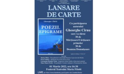 * evenimentul este organizat de Consiliul Județean, Primăria Municipiului, Centrul de Creație și Comunitatea Rușilor Lipoveni din Brăila * autorul va oferi 30 de „mărțișoare-cărțișoare” primelor...