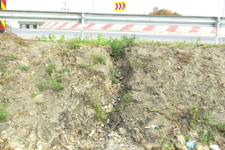 În timpul execuției taluzului, era plăcut privirii când, acesta, cu maiuri mecanice, cu excavatorul şi manual era executat în două trepte, la 45 de grade, lăsând impresia că va fi indestructibil. Numai că, în timp, şi mai ales după nesfârşitele ploi din acest an, taluzul arată îngrijorător: cu foarte multe scurgeri de pământ care au colmatat canalele de preluare a apelor pluviale. Sunt locuri unde au apărut şi adevărate crevase, găuri la baza carosabilului şi a stâlpilor electrici! Doar ici-colo se mai poate vedea un taluz verde, neafectat de ploi. Cât priveşte canalele din beton, în unele zone sunt în contrapantă şi colmatate, sau, pe sute de metri, pline cu bălării. De altfel, toată zona din apropiere de pod, unde a fost organizarea de şantier, este pe hectare întregi ocupată de bălării şi vegetaţie uscată etc. Cine deţine oare aceste terenuri ?!