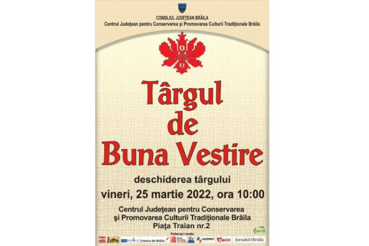 Târg deschis în zi de sărbătoare. Consiliul Județean Brăila, Primăria Municipiului și Centrul Județean pentru Conservarea și Promovarea Culturii Tradiționale (Centrul de Creație) organizează vineri, 25 martie, începând cu ora 10.00, în foaierul Centrului de Creație din Piața Traian nr. 2, etajul I, deschiderea „Târgului de Buna Vestire” dedicat sărbătorii creștine cunoscută în tradiția ortodoxă și sub denumirea de „Blagoveștenia”.