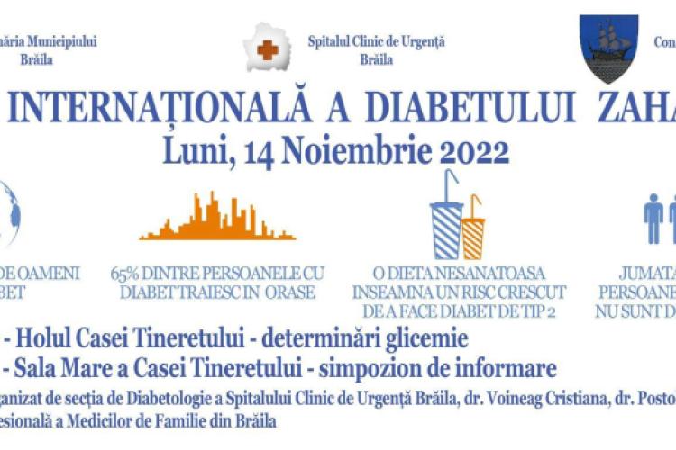 * luni, de Ziua Internațională a Diabetului zaharat, brăilenii se pot testa, gratuit, pentru aflarea glicemiei * evenimentul este organizat de Secția de Diabetologie a Spitalului Clinic Județean de Urgență (SCJU) Brăila, reprezentantă de medicii Voineag Cristiana, Postolache Bianca și Asociația Profesională a Medicilor de Familie Brăila, cu sprijinul Consiliului Județean și a Primăriei Brăila * persoanele interesate trebuie să știe că pot participa gratuit și la simpozion despre diabet, obezitate, complicațiile acestei boli, riscuri și mai ales despre prevenție * pe lângă determinările glicemice gratuite, brăilenii pot primi și glucometre, dar și sfaturi, recomandări și materiale informative despre diabetul zaharat