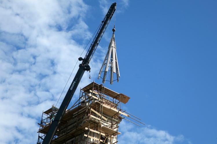 • vechea turlă, care putea fi admirată în fotografiile de epocă, a fost dărâmată, cel mai probabil, de un cutremur din anii ’40 • în cadrul proiectului de restaurare a bisericii, a cărui valoare se ridică la circa 5 milioane de euro, a fost prevăzută şi refacerea turlei • aceasta a fost pusă pe poziţie, ieri, cu ajutorul unei macarale de mari dimensiuni