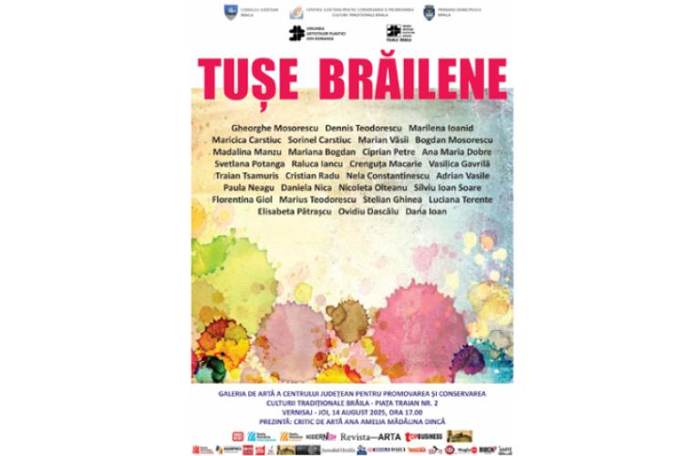 Consiliul Judeţean Brăila, Centrul Judeţean pentru Conservarea şi Promovarea Culturii Tradiţionale, Primăria Municipiului Brăila și Uniunea Artiștilor Plastici din România (UAPR) – Filiala Brăila organizează joi, 14 august, ora 17:00, la Galeria de Artă din Piața Traian nr. 2, vernisajul Expoziției „Tuşe brăilene”.