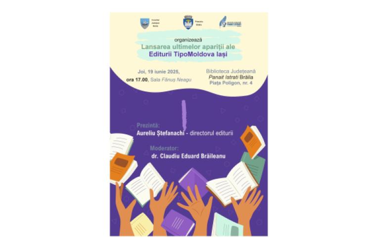 Joi, 19 iunie 2025, începând cu ora 17.00, la Sala „Fănuș Neagu” a Bibliotecii Județene „Panait Istrati” Brăila este programat evenimentul de lansare a ultimelor apariții de la Editura TipoMoldova Iași. Prezintă: Aurel Ștefanachi, directorul Editurii TipoMoldova. Moderează: dr. Claudiu Eduard Brăileanu, șef serviciu în cadrul Bibliotecii Județene „Panait Istrati” Brăila.