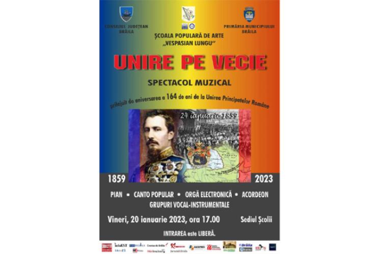 „Vă invităm la spectacolul muzical „Unire pe vecie”, organizat cu prilejul aniversării a 164 de ani de la Unirea Principatelor Române, în ziua de 20 ianuarie 2023, ora 17.00, la sediul Școlii. În program vor fi incluse momente susținute de soliști de la clasele de canto popular, orgă electronică și acordeon, precum și de grupuri vocal-instrumentale din cadrul Școlii”, precizează surse din cadrul instituției.