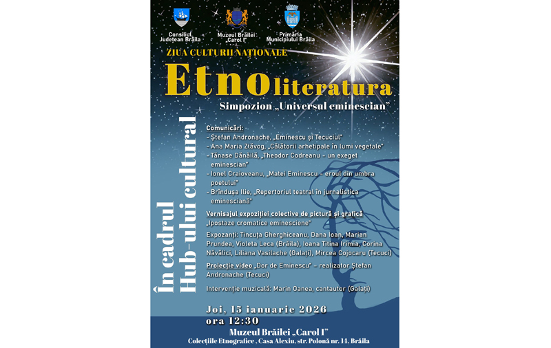 Casa Colecțiilor Etnografice din cadrul Muzeului Brăilei „Carol I” organizează joi, 15 ianuarie, începând cu ora 12:30, Simpozionul „Universul eminescian”, dedicat Zilei Culturii Naționale și marelui poet și om de cultură Mihai Eminescu. Manifestarea va avea loc la Casa Alexiu, monument istoric din Strada Polonă nr. 14, fiind prima întâlnire din anul 2026 în cadrul Hub-ului cultural „Etnoliteratura”.