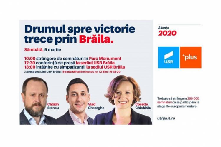 “Vino să îi cunoşti pe Cosette Chichirău, Deputat în Parlamentul României, Vlad Gheorghe, candidat USR pentru Parlamentul European şi Cătălin Stancu, preşedinte USR Brăila. Sâmbătă, 9 martie, la ora 10:00, ne vom întâlni pentru a strânge semnături în Parcul Monument, urmând ca la ora 12:30 să avem o conferinţă de presă la sediul USR Brăila de pe strada Mihai Eminescu, nr. 14. De la ora 13:00 îi aşteptăm pe cetăţenii Brăilei, pentru a discuta despre importanţa votului din 26 mai”, se arată pe pagina de Facebook a USR-iştilor.