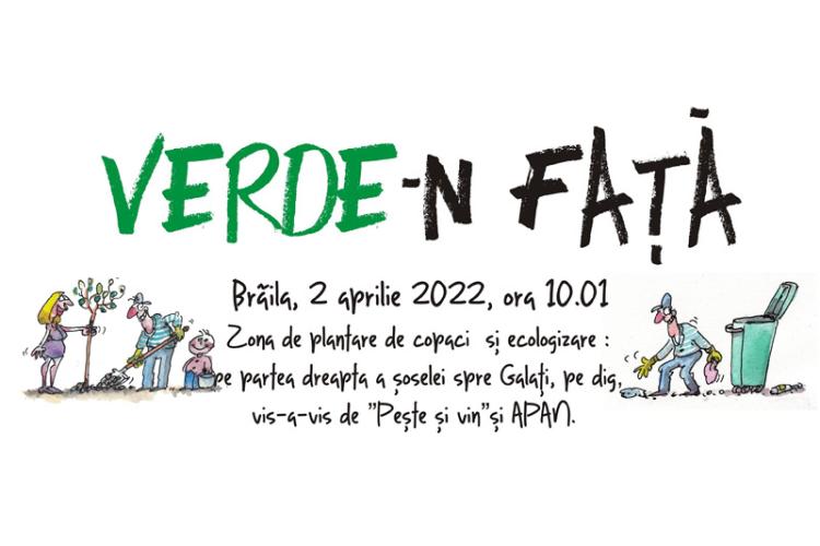 Sâmbătă, 2 aprilie, de la ora 10.01, caricaturistul brăilean Costel Pătrășcan ne invită din nou să facem curățenie de primăvară, de data aceasta în cadrul campaniei de ecologizare și plantare de copaci “Verde-n față”. Zona în care se va desfășura activitatea este situată pe partea dreaptă a șoselei spre Galați, pe dig, vis-a-vis de restaurantul “Pește și vin”, iar brăilenii de toate vârstele sunt îndemnați să se alăture campaniei. Evenimentul organizat de Pătrășcan a devenit deja o tradiție, fiind la a patra ediție.