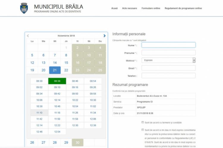 • Primăria Municipiului Brăila anunţă că începând de vineri se simplifică procedura prin care cetăţenii îşi pot obţine actele de identitate • pentru a se programa online, brăilenii trebuie să intre pe site-ul primăriei, la secţiunea “Programare cărţi identitate”, şi să completeze câmpurile aferente • edilul Marian Dragomir ne-a declarat că noua facilitate introdusă nu a costat niciun leu, sistemul fiind implementat de IT-ştii instituţiei pe care o conduce