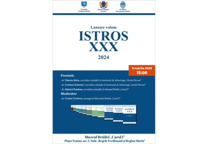Muzeul Brăilei „Carol I” îi invită pe brăilenii pasionați de istoria acestori locuri binecuvântate în ziua de miercuri, 5 martie, începând cu ora 15:00, la lansarea volumului ISTROS XXX, apărut la Editura Istros a Muzeului Brăilei „Carol I” în anul 2024. Evenimentul va avea loc la sediul central al Muzeului Brăilei „Carol I”, din Piața Traian nr. 3, Sala Regele Feredinand I și Regina Maria”.