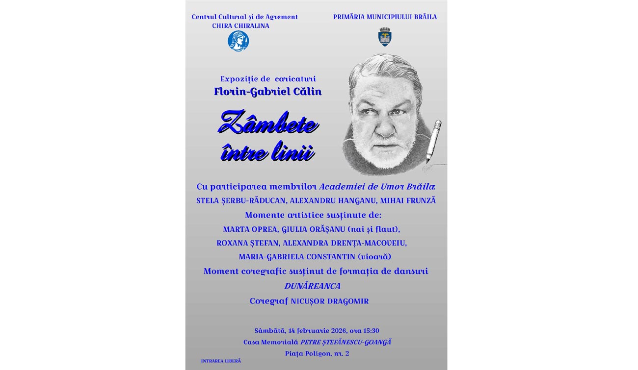 Centrul Cultural și de Agrement „Chira Chiralina” Brăila organizează sâmbătă, 14 februarie 2026, începând cu ora 15:30, la Casa Memorială „Petre Ștefănescu-Goangă”, din Centrul Istoric al municipiului, manifestarea cultural-artistică intitulată „Zâmbete între linii”.
