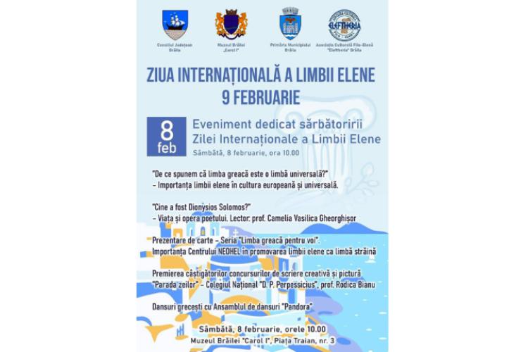 Muzeul Brăilei „Carol I” (sediul central din Piața Traian nr. 3) găzduiește sâmbătă, 8 februarie, de la ora 10:00, un eveniment cultural de excepție, pus la punct de Asociația Culturală Filo – Elenă „Eleftheria” Brăila în colaborare cu instituția gazdă, Consiliul Județean Brăila și Primăria Municipiului Brăila: Ziua Internațională a Limbii Elene, care se sărbătorește anual, pe data de 9 februarie.