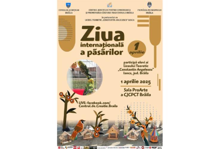 Consiliul Judeţean Brăila, prin Centrul Judeţean pentru Conservarea şi Promovarea Culturii Tradiţionale (Centrul de Creație) Brăila și Primăria Municipiului Brăila, în parteneriat cu Liceul „Constantin Angelescu”, din orașul Ianca, organizează în ziua de marți, 1 aprilie, ora 12:00, un eveniment cultural-educativ dedicat Zilei Internaționale a Păsărilor, „cea mai veche sărbătoare din calendarul mediului”, care are la bază Convenţia Internațională pentru Protecția Păsărilor, semnată la 1 aprilie 1906, document ce promovează principii legate de protecția acestor viețuitoare, prin ocrotirea habitatelor lor.