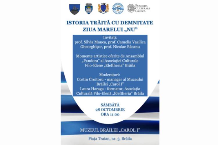Ziua Marelui NU – a doua Sărbătoare Națională a Greciei – va fi sărbătorită astăzi, 28 octombrie 2023, ora 11.00, la sediul Muzeului Brăilei „Carol I”, din Piața Traian nr. 3. Organizator al evenimentului este Asociația Culturală Filo-Etenă „Eleftheria” Brăila, în parteneriat cu Consiliul Județean Brăila, Primăria Municipiului Brăila, Muzeul Brăilei „Carol I” și Fundația Culturală Greacă.