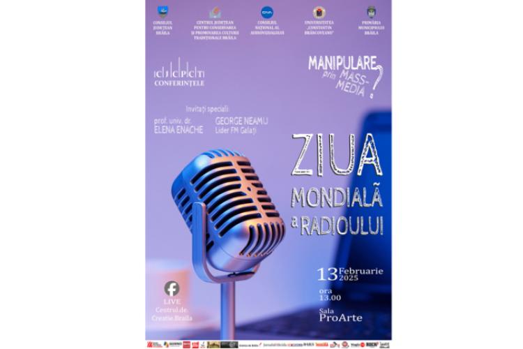 Astfel, Centrul Județean pentru Conservarea și Promovarea Culturii Tradiționale Brăila (centrul de Creație), Consiliul Județean și Primăria Municipiului Brăila, în parteneriat cu Consiliul Național al Audiovizualului (CNA) și Universitatea „Constantin Brâncoveanu”, organizează joi, 13 februarie, începând cu ora 13:00, conferința pentru celebrarea Zilei Mondiale a Radioului, desfășurată sub egida „Manipulare prin mass media”.