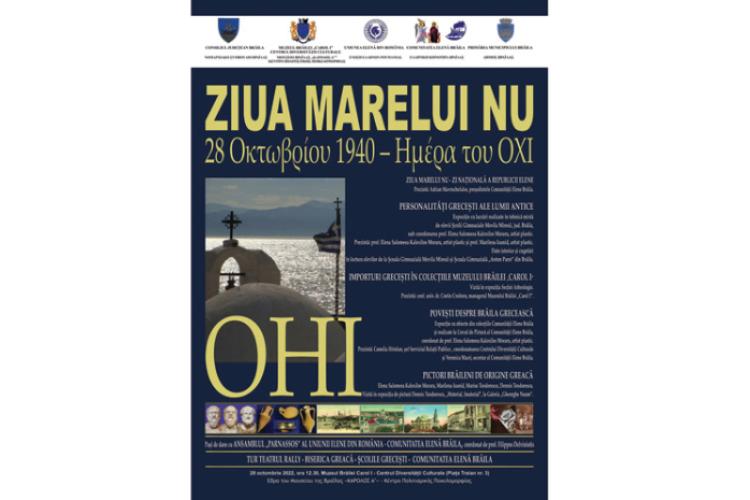 Astăzi, Muzeul Brăilei „Carol I” – Centrul Diversității Culturale, în colaborare cu Uniunea Elenă din România și Comunitatea Elenă Brăila, organizează „Ziua Marelui NU/ 28 octombrie 1940”. Evenimentul, dedicat Zilei Naționale a Greciei, are loc la Centrul Diversității Culturale din cadrul Muzeului Brăilei „Carol I”, Piața Traian nr. 3, începând cu ora 12.30. Potrivit comunicatului trimis de Camelia Hristian, șef Serviciul Relații Publice, coordonatoarea Centrului Diversității Culturale, programul zilei cuprinde: „Ziua Marelui NU – Ziua Națională a Republicii Elene” (prezintă Adrian Mavrochefalos, președintele Comunității Elene Brăila; „Personalități grecești ale lumii antice”, expoziție cu lucrări realizate în tehnică mixtă de elevii Școlii Gimnaziale Movila Miresii, jud. Brăila, sub coordonarea prof. Elena Salomeea Kaloxilos Moraru, artist plastic. Prezintă: prof. Elena Salomeea Kaloxilos Moraru, artist plastic și prof. Marilena Ioanid, artist plastic; „Date istorice și cugetări” în lectura elevilor de la Școala Gimnazială Movila Miresii și Școala Gimnazială „Anton Pann” din Brăila; „Importuri grecești în colecțiile Muzeului Brăilei „Carol I” (vizită la Secția Arheologie) – prezintă conf. univ. dr. Costin Croitoru, managerul Muzeului Brăilei „Carol I; „Povești despre Brăila grecească”, expoziție cu obiecte din colecțiile Comunității Elene Brăila și realizate la Cercul de Pictură al Comunității Elene, coordonat de prof. Elena Salomeea Kaloxilos Moraru. Prezintă: Camelia Hristian, șef Serviciul Relații Publice și Veronica Macri, secretar al Comunității Elene Brăila; „Pictori brăileni de origine greacă” – Elena Salomeea Kaloxilos Moraru, Marilena Ioanid, Marius Teodorescu, Dennis Teodorescu; „Vizită în expoziția de pictură Dennis Teodorescu, „Material, Imaterial”, la Galeria „Gheorghe Naum”; pași de dans cu Ansamblul „Parnassos” al Comunității Elene Brăila, coordonat de prof. Filippos Delviniotis; tur: Teatrul Rally – Biserica Greacă – școlile grecești – Comunitatea Elenă Brăila.