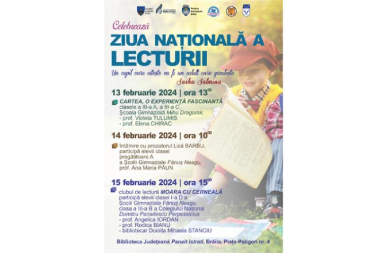 Biblioteca Județeană ”Panait Istrati” Brăila organizează în săptămâna 12 – 17 februarie 2024 o serie de activități prilejuite de Ziua Națională a Lecturii, cu participarea elevilor din școlile brăilene. Campania își propune să stabilească lectura ca obicei în rândul tuturor persoanelor și categoriilor de vârstă. În același timp, inițiativa vine să sublinieze că lectura devine o abilitate cheie pentru învățarea pe tot parcursul vieții.